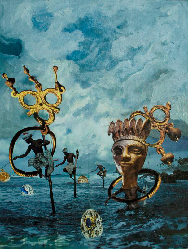 Time fishing. 2015. Collage and oil on canvas. 40 x 30 cms.